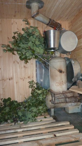 Специальный прицеп с банной будкой соорудили местные жители - Александр Михайлик, Петр Штефан, и два сына Михайлика - Александр и Максим. На изготовление ушел месяц. В бане есть раздевалка, дровяная печь, 200-литровый бак и обшитый деревом бокс для купания.