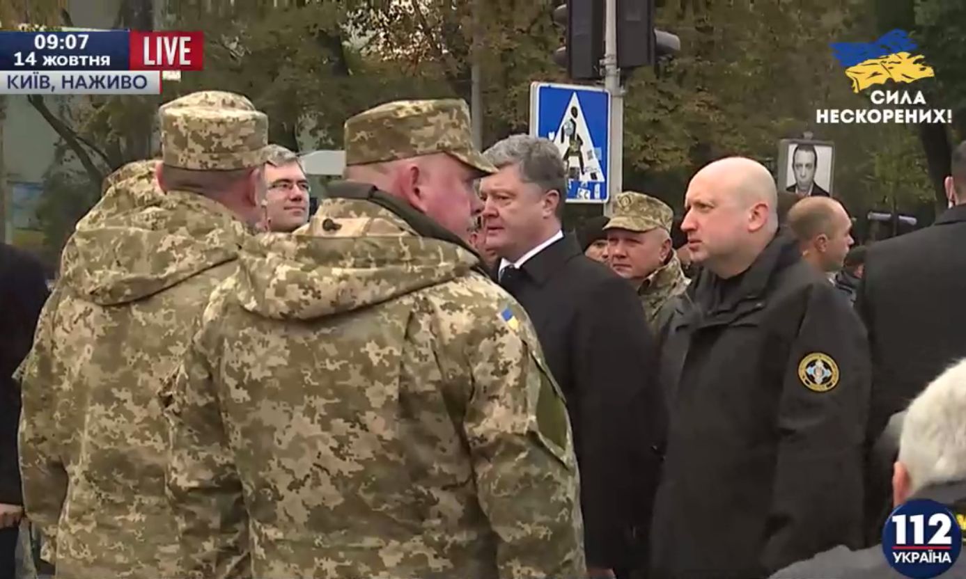 Президент Украины Петр Порошенко и другие официальные лица прибыли на открытие выставки военной техники "Сила непокоренных" на Михайловской площади в Киеве, сообщает телеканал "112 Украина".