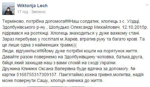 - Терміново, потрібна допомога!!!! Наш солдатик, хлопець з с. Уїздці, Здолбунівського р-ну., Шолудько Олександр Михайлович. 12.10.2015р. підірвався на розтяжці. Хлопець знаходиться у дуже важкому стані. Зараз перебуває у госпіталі м.Харків, втратив руку та багато крові. Та це лише одна з найменших травм.