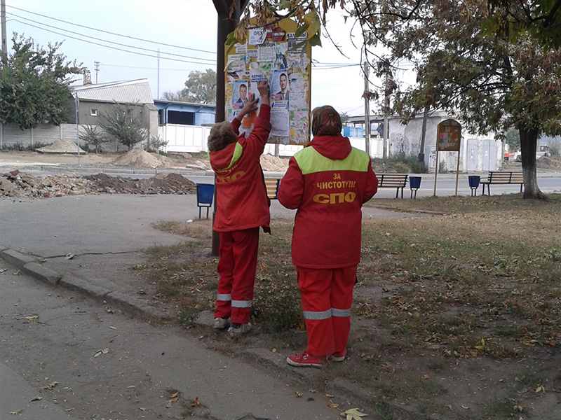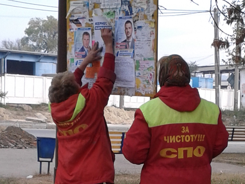 «Сегодня утром зафиксировала очень "умилительную" картину. Две дворничихи (работники СПО) клеили на доске объявлений на углу улиц Дмитриевской и Чеботарской (Ленинский район) агитационные плакаты. Сначала Мусеева, а потом Кернеса. При этом их диалог меня потешил. Одна говорит другой: "Последний раз занимаюсь этим...". В общем я поняла - стремно теткам этим заниматься. Тем не менее, использование админресурса налицо», - отмечается в комментарии к фото.