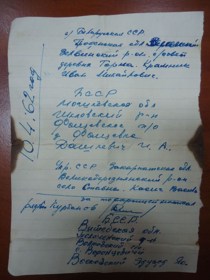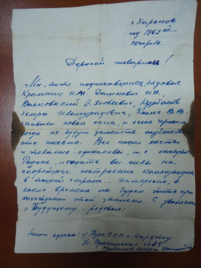«Мы, нижеподписавшиеся рядовые Крамник И.М, Дашкевич И.Я., Васковский Э.Яковлевич, Курбанов Хемра Ильшурадович, Касич В.В ставим новые окна и очень просим, кода их будут заменять, опубликовать это письмо. Все наши мысли и желания - одинаковы т.е. отслужить Родине, и отдать все силы на скорейшее построение коммунизма в нашей стране... Интересно, в какие времена мы будем жить при нахождении этой записки. С уважением к Будущему - рядовые», - написали в далеком 1962 году советские военные.