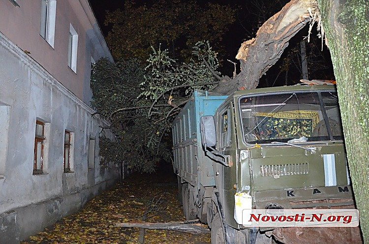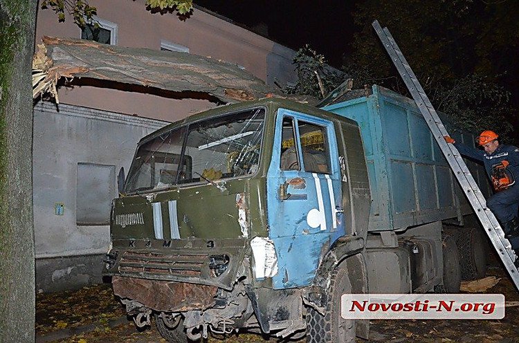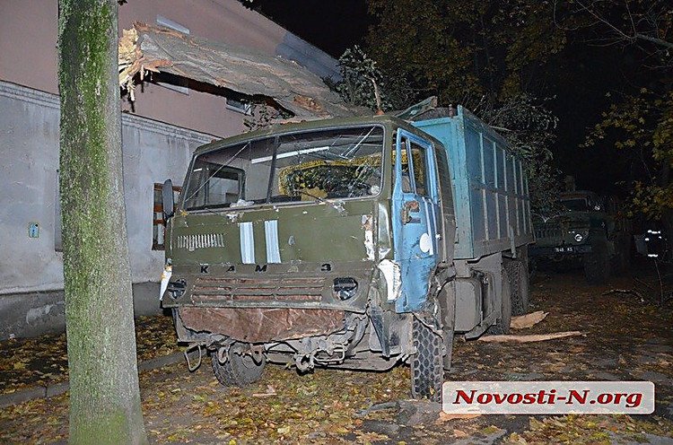 В центре Николаева армейский КамАЗ вылетел с дороги на тротуар и снес два дерева.