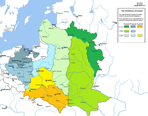В 1795 году в Петербурге из-за поражения восстания Костюшко Пруссия, Россия и Австрия подписали конвенцию о третьем разделе Речи Посполитой, что означало прекращение существования государства. Пруссия получила Торунь, Гданск и Познань, к России отошли Курляндия, Западная Белоруссия, Западная Украина (Луцк, Каменец-Подольский) и Литва, а в состав Австрии вошли Люблинская и Хелмская земли.