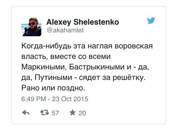 Копия удаленной записи сохранилась в архиве интернета. Шелестенко написал буквально следующее: "Когда-нибудь эта наглая воровская власть, вместе со всеми Маркиными, Бастрыкиными и - да, да, Путиными - сядет за решетку. Рано или поздно".
