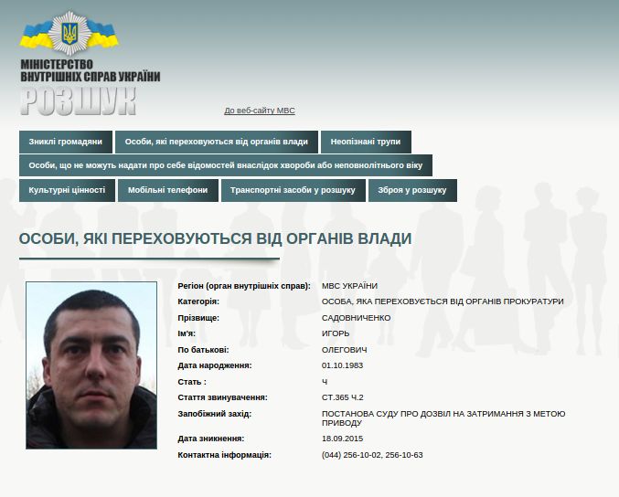 МВД объявило в розыск экс-сотрудника "Беркута" 32-летнего харьковчанина Олега Садовниченко. Информация об этом появилась в пятницу на официальном сайте ведомства. Харьковчанина подозревают в превышении власти или служебных полномочий с применением насилия. Если беглого милиционера поймают, ему светит три года тюрьмы.