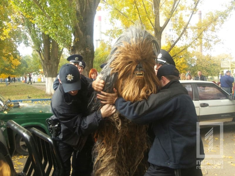 Правоохранителям пришлось применить силу и скрутить Чубакку. Огромных трудов полиции стоило стянуть перчатки костюма, чтобы надеть на нарушителя наручники.