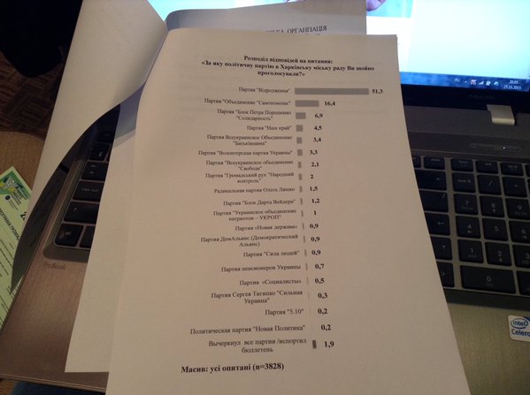 Харьковский горсовет: Видродження - 51,3%; Самопомич - 16,4%; БПП - 6,9%; Наш Край - 4,5%, Батькивщина - 3,4%, Волонтерская партия - 3,3%