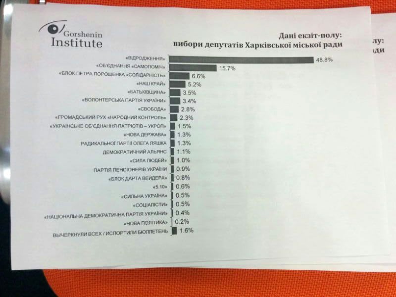 Как сообщалось, по данным экзитпола, проведенного КИУ, по выборам Харьковского городского головы: Кернес набирает 59,3%, Ситенко-16,4%, Сапронов-6,3%, Балута-5,3%, Давтян - 4,5 %.
