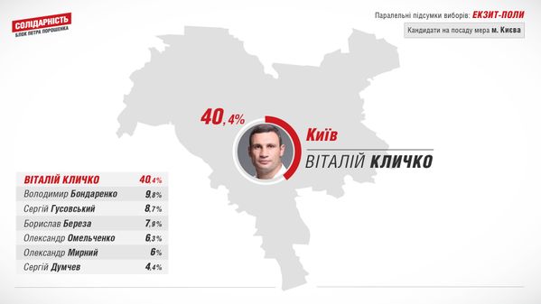За оприлюдненою у Twitter інфографікою, Володимир Кличко отримав у Києві 40% голосів, одразу за ним ідуть Володимир Бондаренко (9,8%) та Сергій Гусовський (8,7%).