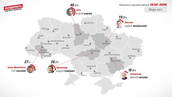 Кандидати у мери міст від "Солідарності" перемогли у Києві, Полтаві, Запоріжжі, Кіровограді та Івано-Франківську.