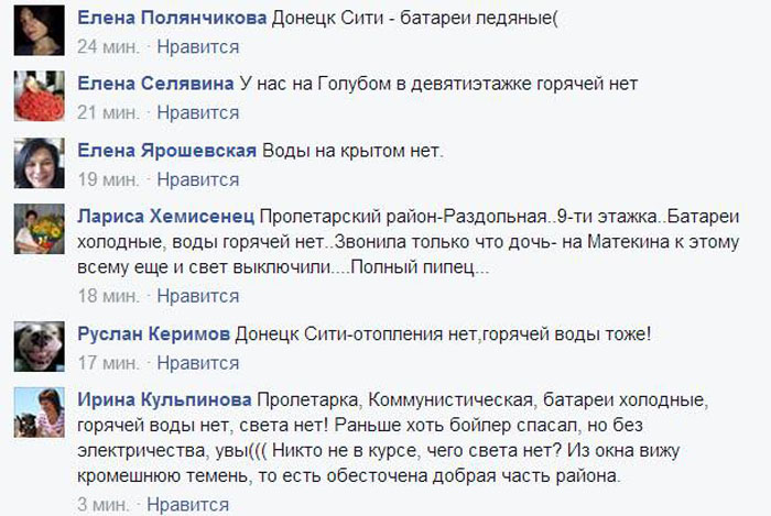 В некоторых районах Донецка и практически во всей Макеевке уже третий день отсутствует отопление. Котельные не могут нормально функционировать из-за критически низкого давления в газопроводе. Отсутствие газа спровоцировал затянувшийся конфликт руководителей «народных республик» с владельцем нескольких газовых компаний Сергеем Курченко. Кроме того, жителей «республики» не спасают ни обогреватели ни бойлеры из-за постоянных проблем с электричеством. Насущные проблемы активно обсуждаются во многих донецких пабликах.