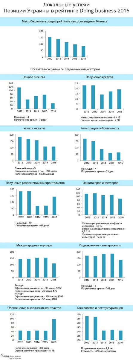 Всемирный банк презентовал результаты нового исследования Doing Business-2016 (охватывает результаты за второе полугодие 2014-го и первое полугодие 2015-го). Украина заняла в новом рейтинге 83 место из 189 стран мира и сейчас располагается между Брунеем и Саудовской Аравией. Второй год подряд Украина в рейтинге растет - в прошлом году мы отыграли 16 позиций, в этом - 13, превзойдя даже прогноз Петра Порошенко, предполагавшего улучшение на 10 позиций, сообщает портал ЛИГА.