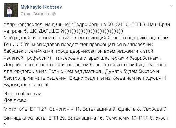 1. Предварительные итоги местных выборов в Харькове вызвали у значительной части общества (и у нас в регионе, и в целом по стране) внутренний протест и разочарование. Победа Геннадия Кернеса в первом туре и результаты партии «Возрождение» многих шокировали. Как следствие - волны публичного недовольства с переходом на критику местной власти.
