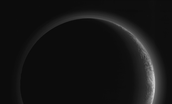 На изображении хорошо видны детали освещенной Солнцем стороны Плутона и подсвеченные солнечными лучами слои атмосферы. На освещенной стороне Плутона видна ледяная долина Спутник в окружении гор до 3,5 км высотой и ледников.