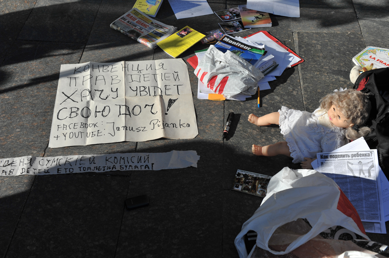 Возле входа в здание облсовета он установил импровизированную выставку, на которой фото его дочери, игрушки, письма из различных инстанций. Здесь же плакат – «Хочу увидеть свою дочь».