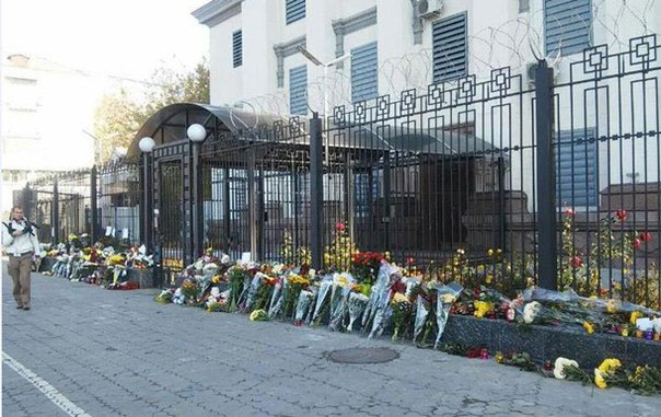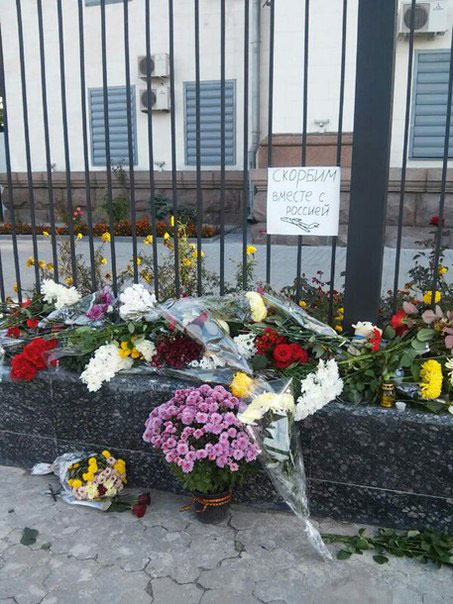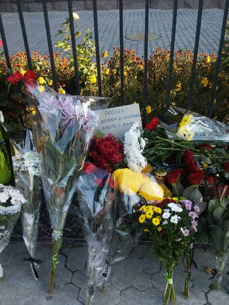 Это сегодняшние фотографии у здания российского посольства в Украине. Цветы, записки с соболезнованиями. Нормально. Так и должно быть в уважающей себя стране. Помните, как в Москве несли цветы к украинскому посольству 14 июня 2014 года, когда возле Луганска был сбит транспортный самолет с днепропетровскими десантниками? Не помните? Ах, да. Никто ведь ничего не принес.