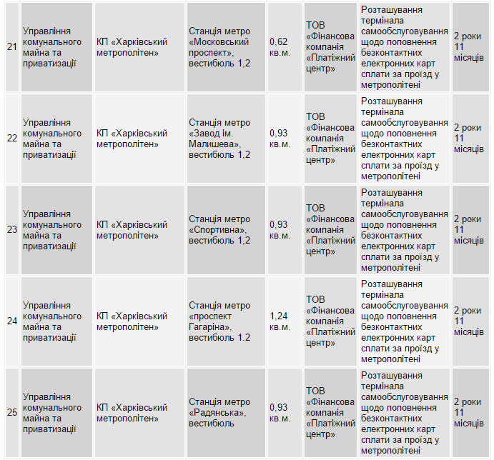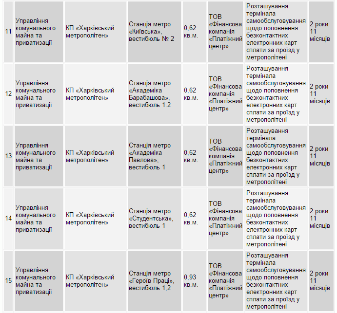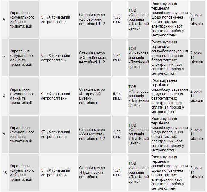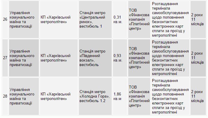 Зокрема, ТОВ «Фінансова компанія «Платіжний центр» отримала дозвіл на оренду місць для розміщення терміналів на всіх станціях метро Харкова, крім однієї – «Площі повстання». Дозволи на розташування терміналу надані на 2 роки 11 місяців.
