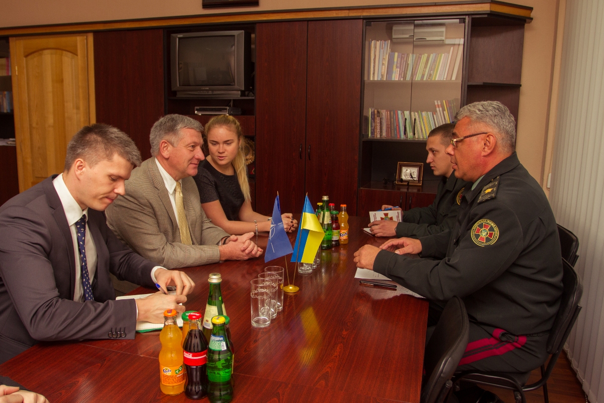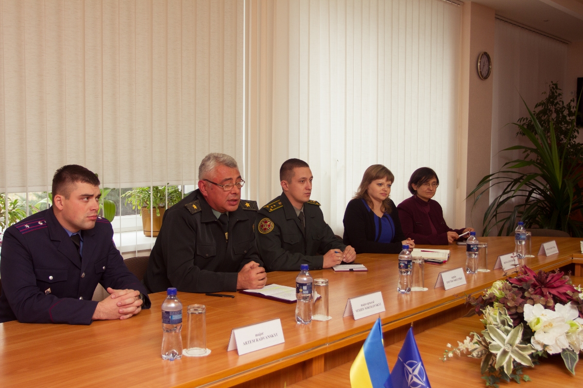 За круглым столом дальнейшее сотрудничество с представителями НАТО обсудили генерал-майор Сергей Соколовский, начальник языкового отдела Артем Радванской, заведующая кафедрой филологии, перевода и речевой коммуникации Ирина Лисичкина, преподаватель той же кафедры Светлана Ревуцкая и представитель Главного управления Национальной гвардии капитан Дмитрий Шелудько.