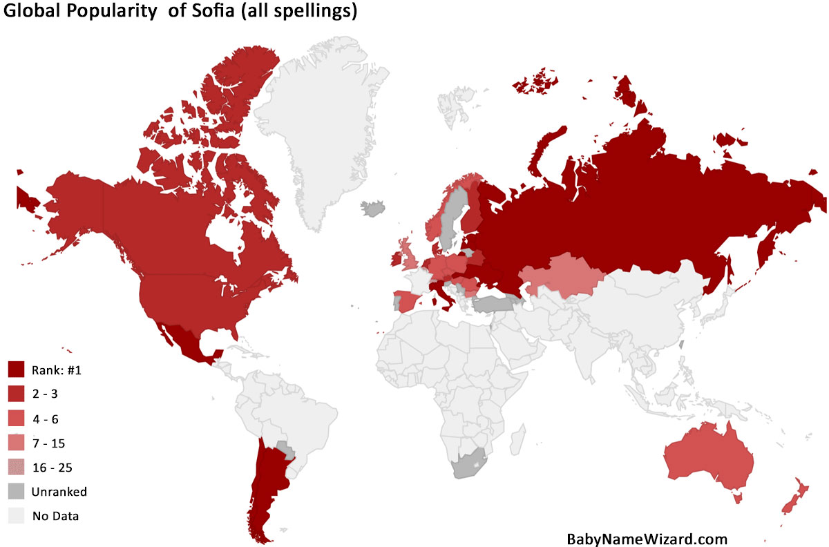 И все же картина по странам мира в целом остается пока недостаточной. Так, некоторые государства не ведут подобной статистики (как, например, Греция, где имя София тоже наверняка любят), другие публикуют только пять-десять самых популярных имен (там София запросто может попасть в первую двадцатку). А некоторые вообще ведут отдельную статистику для разных вариаций одного имени — например, Sophia, Sofia и Sophie.