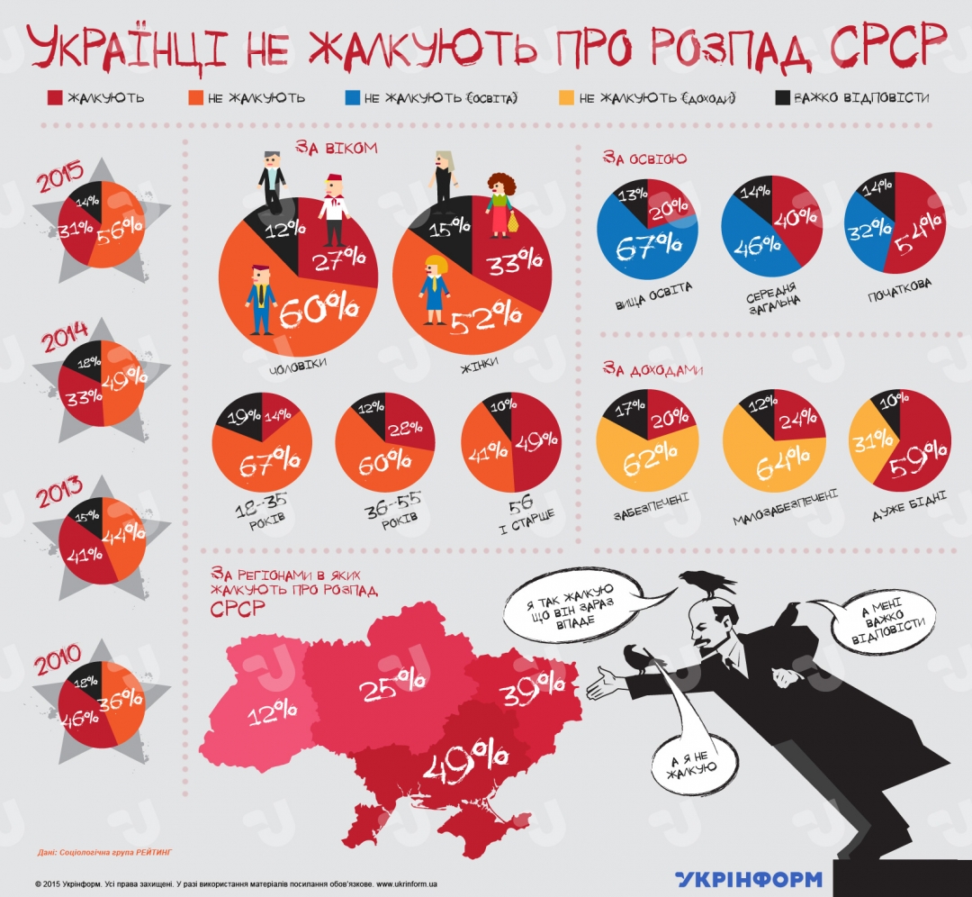 С 1 по 6 октября 2015 социологическая группа «Рейтинг» провела исследование, которое определило, насколько сильно украинцы сожалеют о распаде Советского Союза в 1991 году.