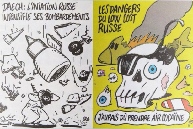 В последнем номере Charlie Hebdo в рубрике "Обложки, которых вы избежали" опубликованы две карикатуры, связанные с крушением A321. На одной из них изображены обломки самолета и части тел пассажиров, падающие на боевика запрещенной в России экстремистской группировки "Исламское государство". Подпись: "Российская авиация усиливает бомбардировки ИГИЛ".