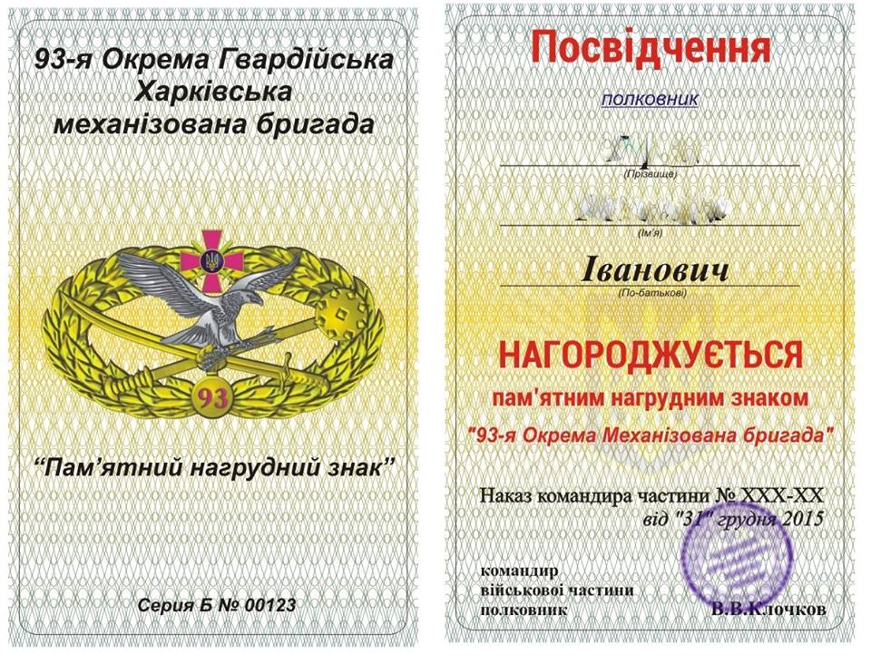 Руководством 93 ОМБр разработан памятный знак "93 ОМБр". Он утвержден в геральдике и в генеральном штабе. Для военнослужащих воевавших в 93 бригаде. Этот знак будет вручаться не всем. Он будет вручаться только тем, кто воевал. Воевал по честному, по настоящему. Приказом кобрига, с занесением данных в военный билет.
