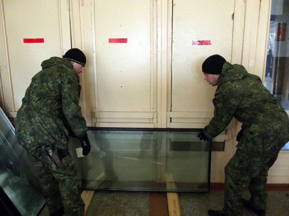 Сразу после дежурства по охране общественного порядка бойцы сводного отряда главка полиции «заступили на смену» в школе. Были демонтированы старые трубы, проведены новые коммуникации, застеклены окна.