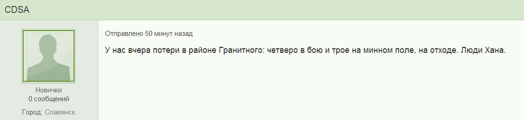 «У нас вчера потери в районе Гранитного: четверо в бою и трое на минном поле, на отходе. Люди Хана», — говорится в сообщении.