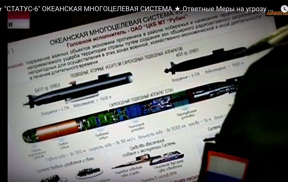 На скриншоте из репортажа хорошо различим текст о назначении системы: «Поражение важных объектов экономики противника в районе побережья и нанесение гарантированного неприемлемого ущерба территории страны путем создания зон обширного радиоактивного заражения, непригодных для осуществления в этих зонах военной, хозяйственно-экономической и иной деятельности в течение длительного времени».