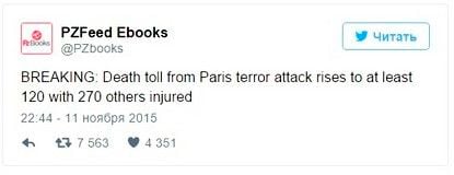 "СРОЧНО: Число погибших в результате террористической атаки в Париже выросло до 120, ранено 270", — сообщалось в "посте", опубликованном в среду в 22:44.