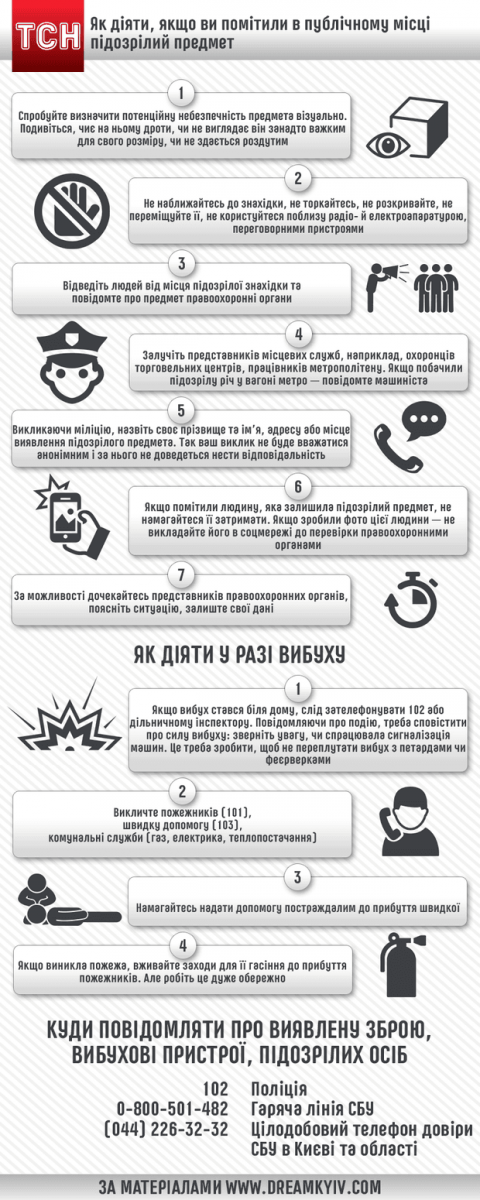 В случае выявления опасных и подозрительных предметов не следует касаться их и приближаться. Людей, которые находятся вблизи с опасными находками, стоит отвести в безопасное место и сообщить о потенциально опасной вещи представителей правоохранительных органов. В случае взрыва следует набрать номер 102 или сообщить участковому инспектору. Также стоит позвонить пожарным, в скорую помощь и коммунальные службы. Если есть пострадавшие, то следует оказать им первую помощь.