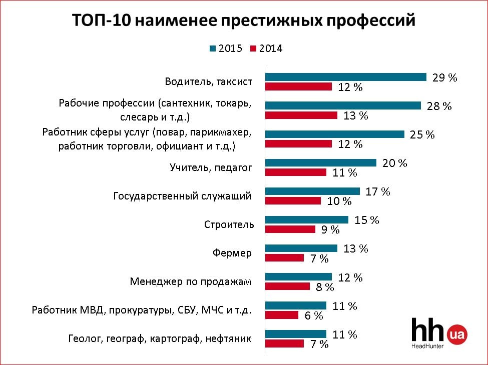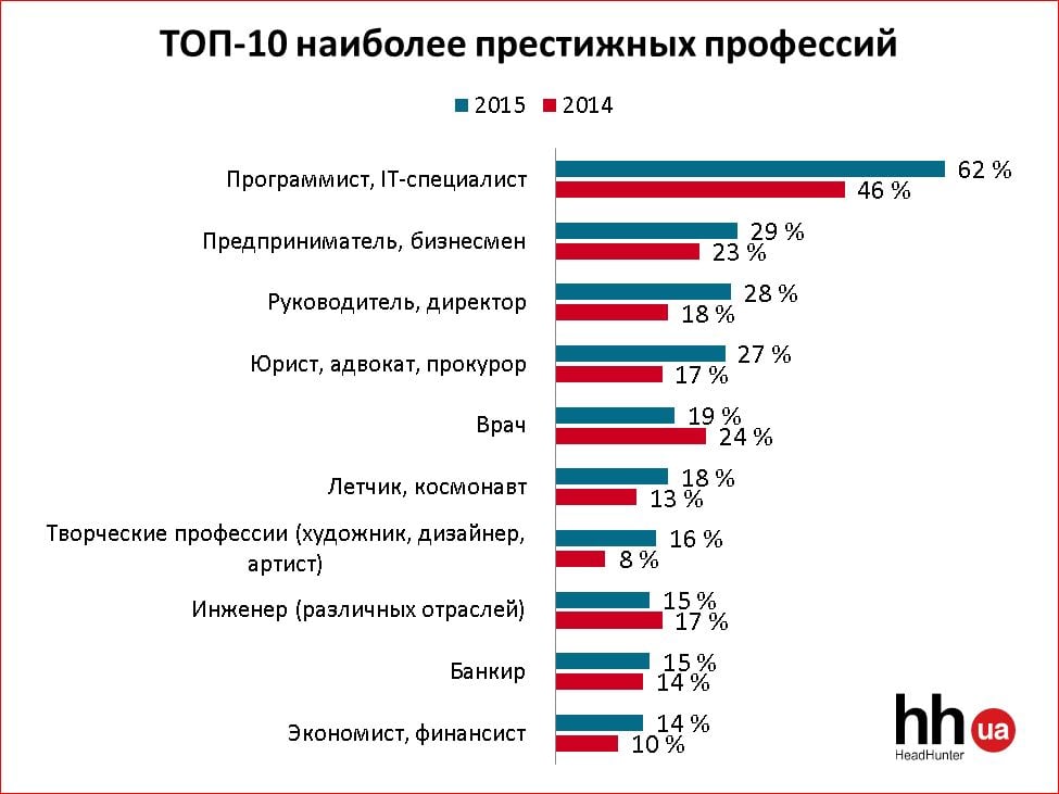 Самой престижной в 2015 году украинцы назвали профессию IT-специалиста. Второе место заняли бизнесмены и владельцы собственного бизнеса, с минимальным отрывом обогнав топ-менеджеров и наемных директоров. Вернулись в рейтинг престижных профессий экономисты и финансисты. По данным нового опроса Международного кадрового портала HeadHunter Украина, непрестижными стабильно считают рабочие специальности, а также работу в сфере услуг.