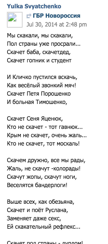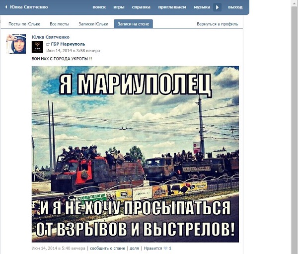 Так, у гражданки Юлии Святченко, которая проживала в Мариуполе https://vk.com/id30466934 (страница уже удалена) и принята в Национальную полицию, найдены записи, которые свидетельствуют о том, что взгляды сотрудницы патрульной службы носят антигосударственных характер.