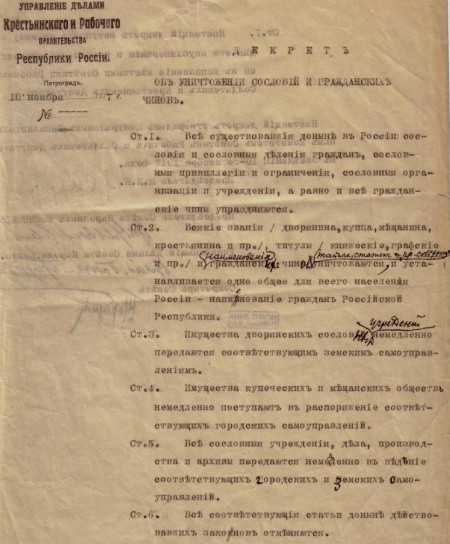 В 1917 году в российский Центральный исполнительный комитет Советов рабочих издал декрет «Об уничтожении сословий и гражданских чинов», который ликвидировал все сословные привилегии и ограничения.