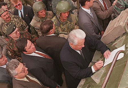В 1996 году , согласно с Хасавюртовскими мирными соглашениями, президент России Ельцин подписал указ о выводе войск из Чечни – окончательно завершилась Первая Чеченская война, унесшая жизни более 100 тысяч мирных жителей.