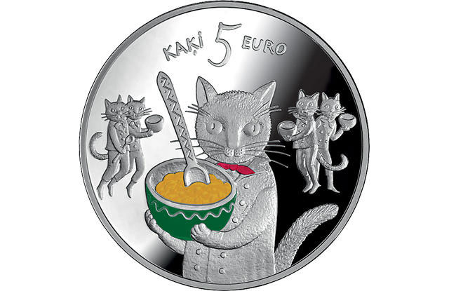 Монета достоинством пять евро сделана по мотивам сказки латышского автора Альберта Кроненберга «Пять котов». В сказке рассказывается про котов по имени Мурис, Нюрис, Инцис, Минцис и Пунцис.