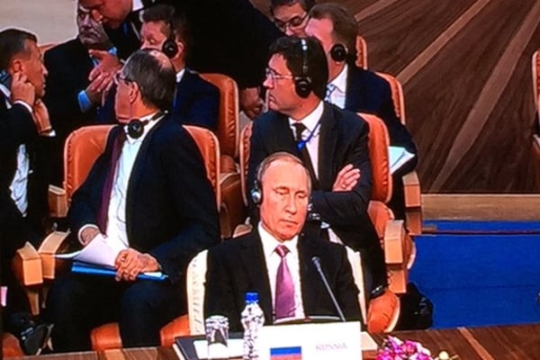 Принимающая сторона не обеспечила перевод на русский и с русского языка, поэтому Путину пришлось остановить выступление и ждать, пока найдут переводчика. Об этом сообщил кремлевский журналист Дмитрий Смирнов в Twitter.