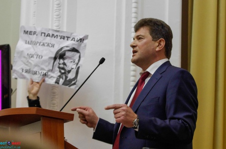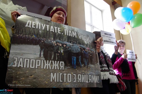 Активисты встретили Буряка плакатами "Требуем секретаря горсовета от демократических сил", "Ахметов геть!", "Осторожно - регионал" и "Депутат, помни: Запорожье - город с яйцами!", напоминая о "яичном воскресенье", когда запорожцы забросали группу пророссийски настроенных активистов яйцами и мукой.
