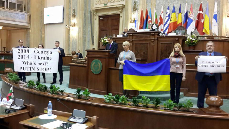 Участники украинской делегации устроили акцию протеста во время выступления спикера Госдумы РФ Сергея Нарышкина на заседании Парламентской ассамблеи Черноморского экономического сотрудничества (ПАЧЭС) в Бухаресте. Об этом сообщил в Facebook народный депутат Андрей Гордеев, сообщает ЛІГА.net.