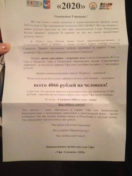 «После саммитов образовались весьма существенные дефициты — дефицит Уфы к октябрю составил 1,1 млрд рублей. Давайте поможем родному городу! Попросту — скинемся! Ведь если разделить сумму дефицита на всех работающих, получится всего 4066 рублей на человека! И при том, что средняя зарплата в Башкирии уже превысила 35 тысяч рублей, нам вполне по силам собрать для мэрии Уфы такую помощь! И тогда саммиты 2020 года — наши!» — говорится в письме.