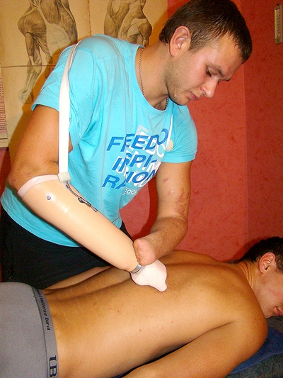 — Модуль — сугубо отечественное изобретение, рассчитанное на применение именно нашими людьми, — объясняет автор приспособления Денис Подкопай. — В развитых странах человек с ограниченными физическими возможностями имеет хорошую социальную поддержку и ему не надо думать, как прокормить семью. Нам же важно сейчас, чтобы молодые ребята и люди среднего возраста, утратившие на фронте прежнюю трудовую квалификацию, освоили новые профессии. Мы с Олегом доказали: человек даже без обеих кистей может стать хорошим массажистом.