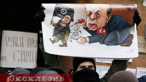 Ответ Ирины был следующим (стилистика и орфография оригинала сохранены): "На митинге у посольства Турции, среди рукописных лозунгов, "сбацанных на коленке", и осуждающих инцидент с российским военным самолетом, затесался плакат вполне профессионального качества. На нем под черным флагом ИГИЛ марширует заведенная ключиком Эрдогана, и, стало быть, ручная, "израильская военщина".