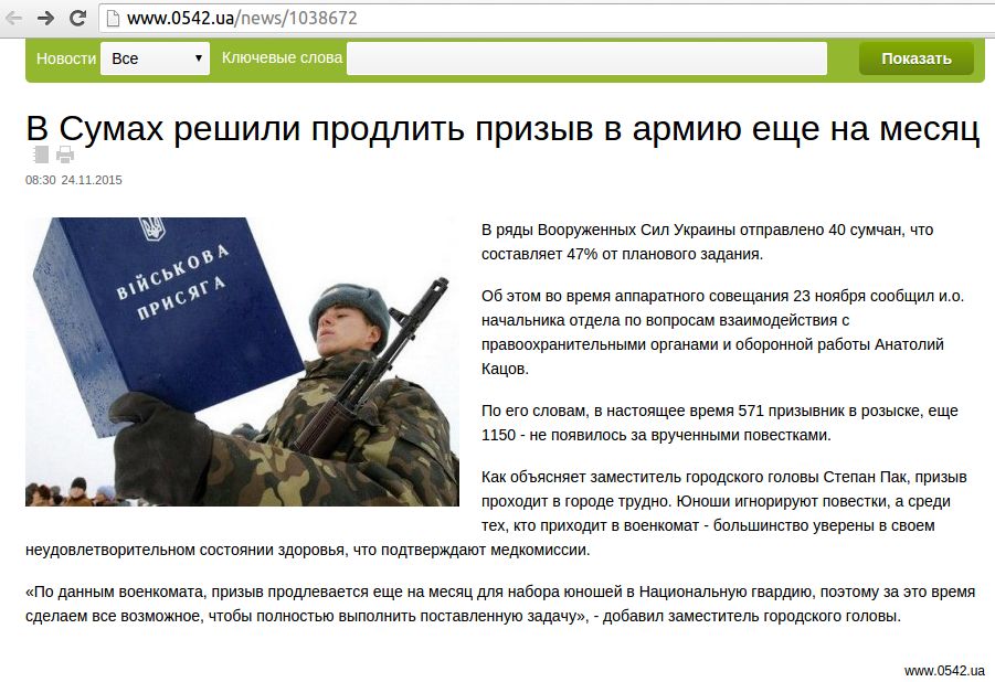 По его словам, в настоящее время 571 призывник в розыске, еще 1150 - не появилось за врученными повестками. Напомним, по "старому" плану из Сумской области должны были призвать на срочную службу 350 человек.