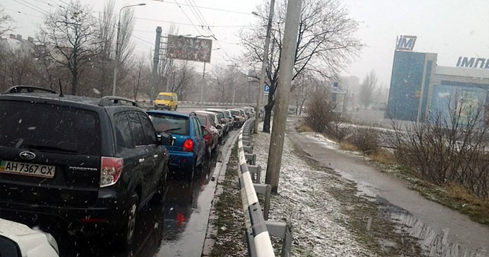 Автомобилисты Донецка разместили в сети фотографии огромной очереди за бензином на улице Богдана Хмельницкого.