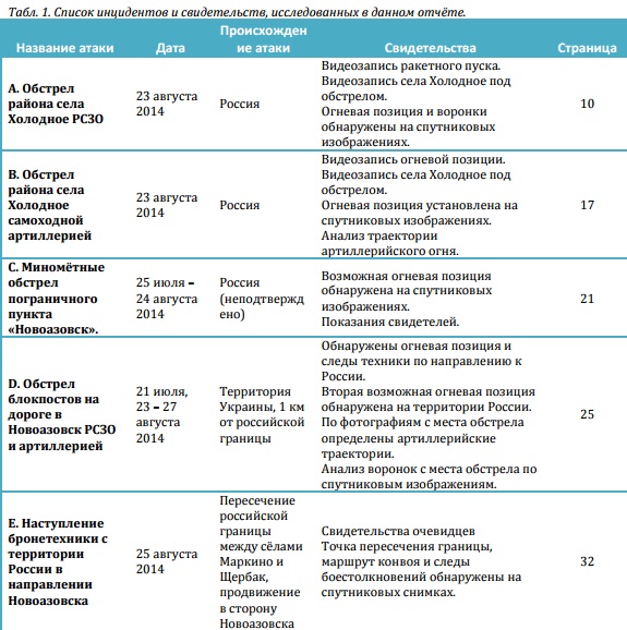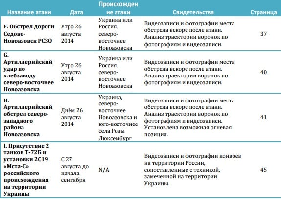 Мы представляем свидетельства из социальных сетей и спутниковые изображения, указывающие на российское происхождение артиллерийских ударов и бронетехники, замеченной в районе Новоазовска, в июле-августе 2014. Два артиллерийских удара 23 августа 2014 были нанесены с территории России. Из России были транспортированы 2 танка Т-72Б и установка 2С19 "Мста-С", замеченные в Новоазовске после захвата города. Также в отчете представлен анализ нескольких атак Новоазовского района в июле-августе 2014 и свидетельства, предполагающие участие в них России", - отмечают журналисты.
