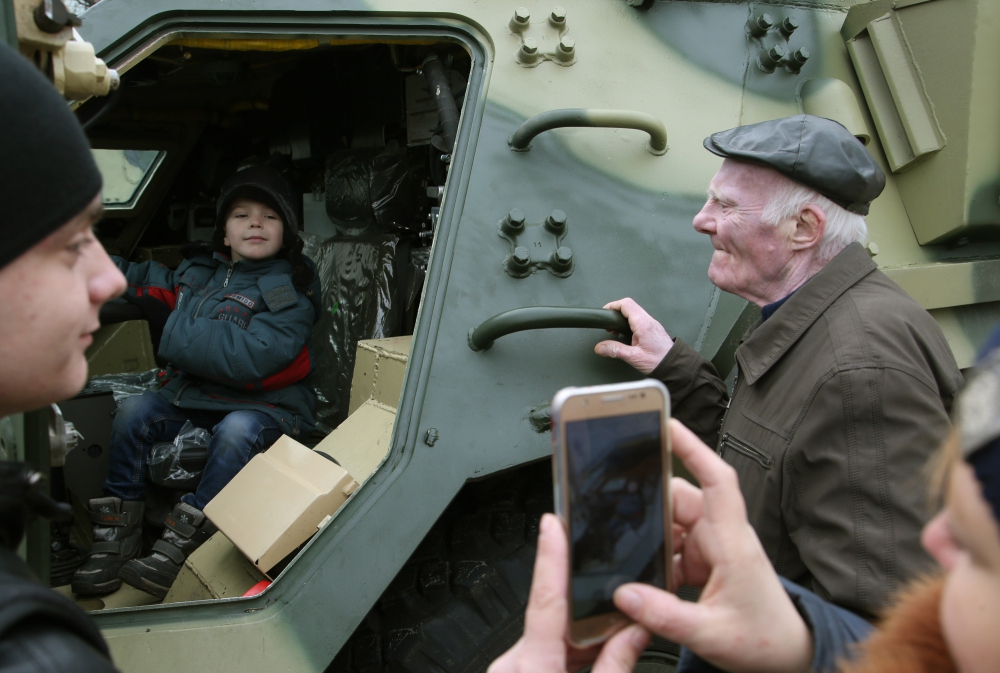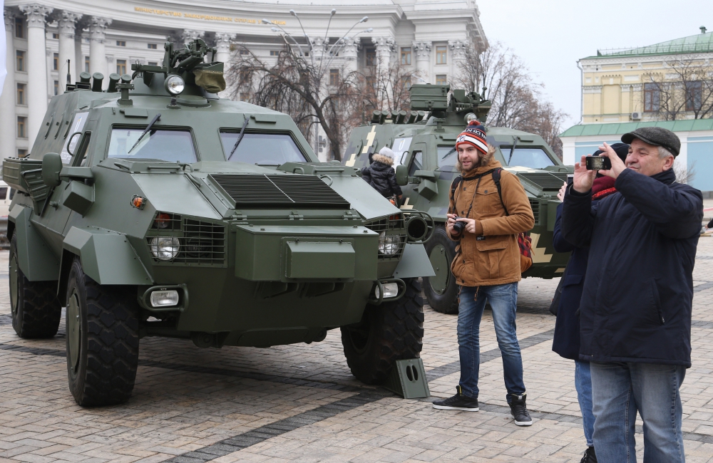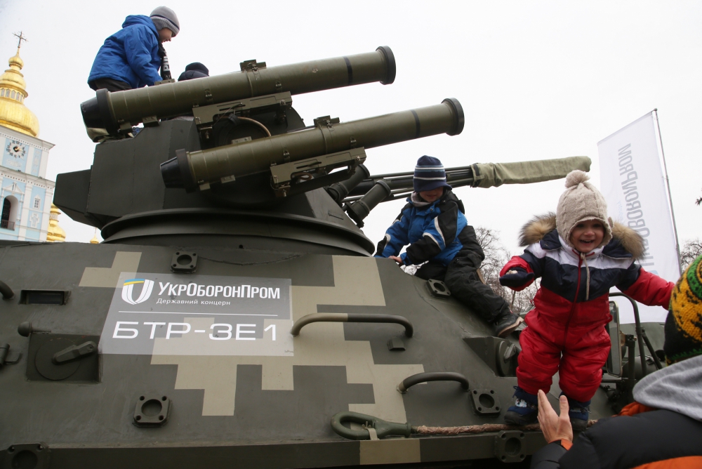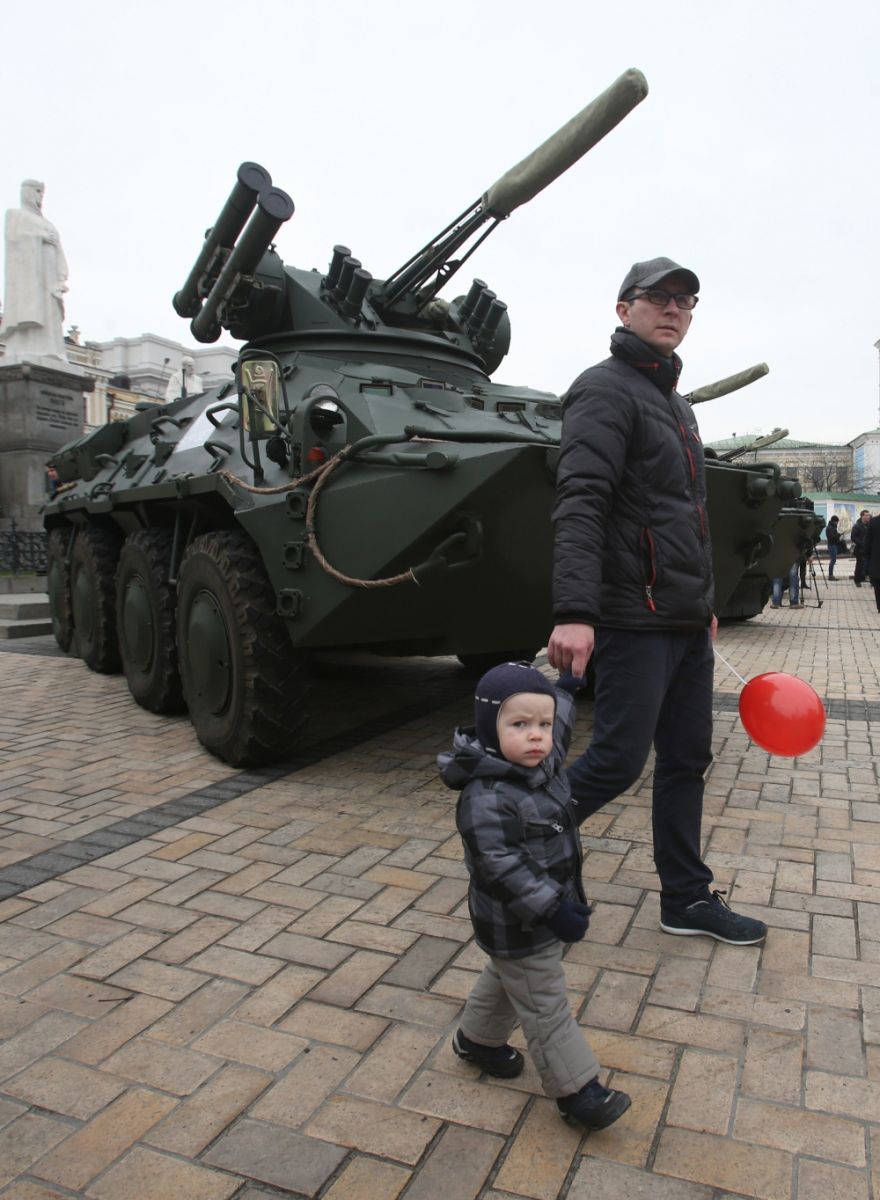 Концерн "Укроборонпром" представляет киевлянам и гостям города образцы бронетехники, выпускаемую украинскими заводами. Это различные модификации бронеавтомобиля "Дозор-Б", "БТР-3" и "БТР-4".