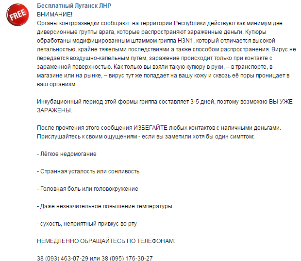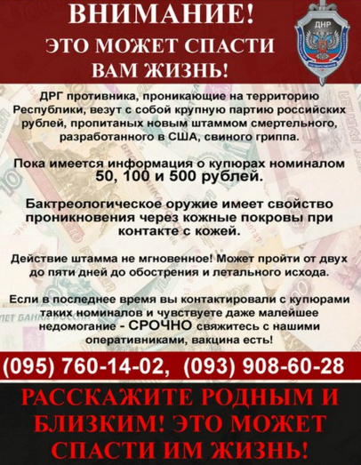 ДРГ противника, проникающие на территорию Республики, везут с собой крупную партию российских рублей, пропитаных новым штаммом смертельного, разработанного в США, свиного гриппа.