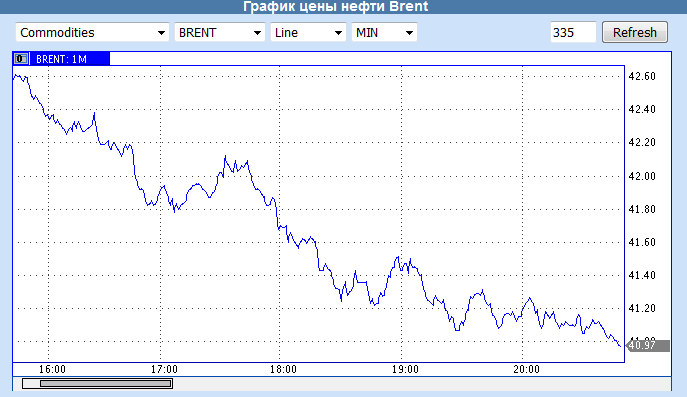 Стоимость фьючерсов на нефть марки Brent упала на бирже до отметки 40,95 долларов за баррель (по состоянию на 19.54 по Киеву), что на 5,32% ниже уровня закрытия предыдущих торгов, сообщает "Главное".