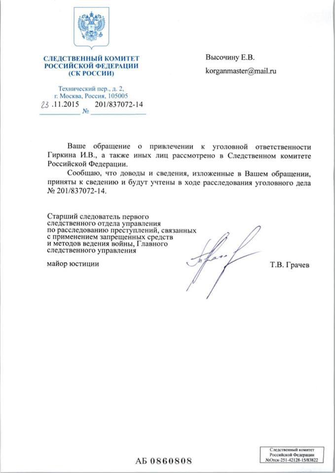 О всем этом, после комментариев Гиркина в соцсетях по поводу "дезертирства" нашей группы, я и написал в СК РФ, дабы привлечь к ответственности нашего "вождя" за угробленные жизни.