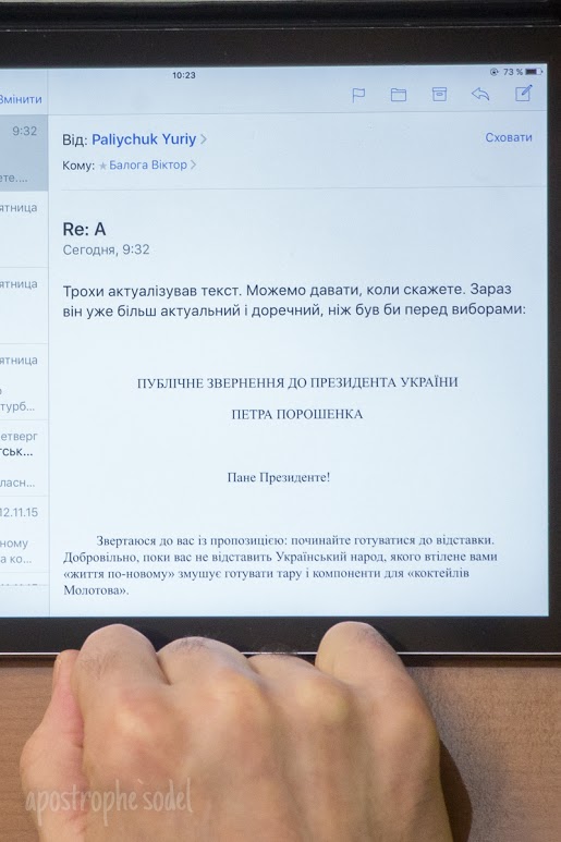 "Немного актуализировал текст. Можем давать, когда скажете. Сейчас он уже более актуальный и своевременный, чем был бы перед выборами",- отмечает в письме Балоге его спичрайтер.